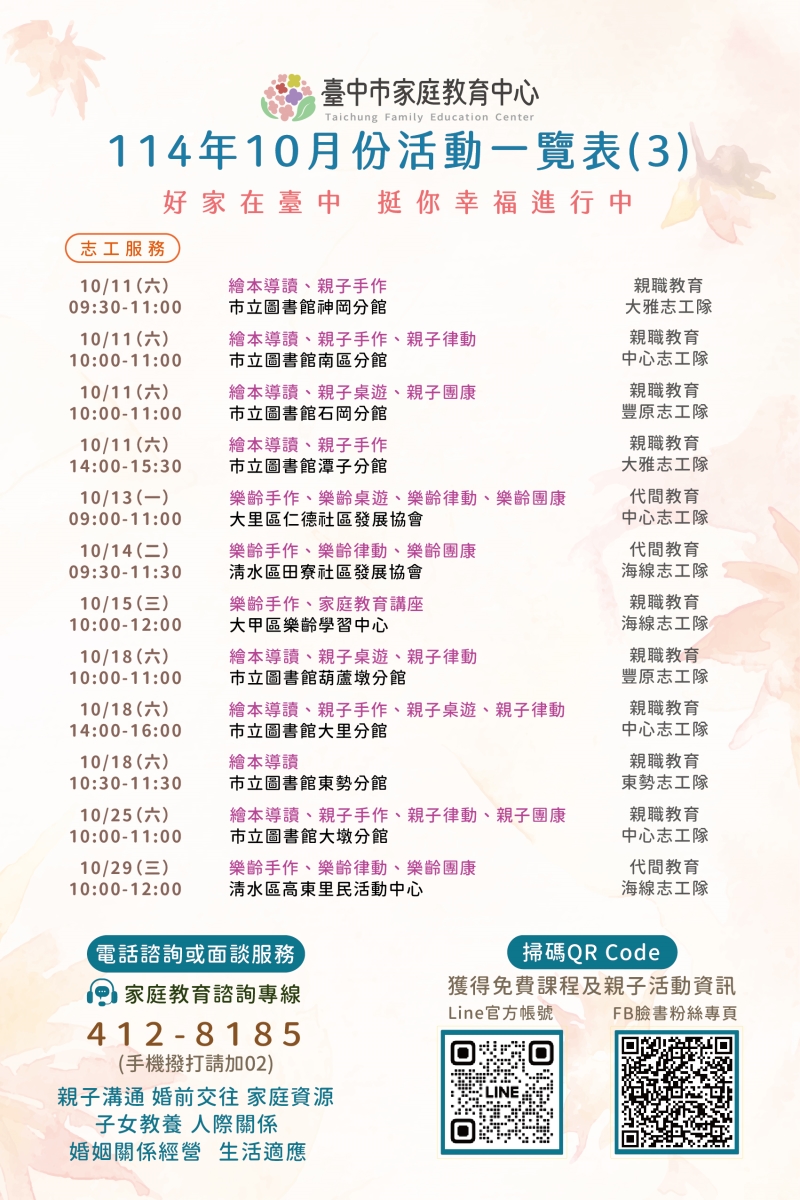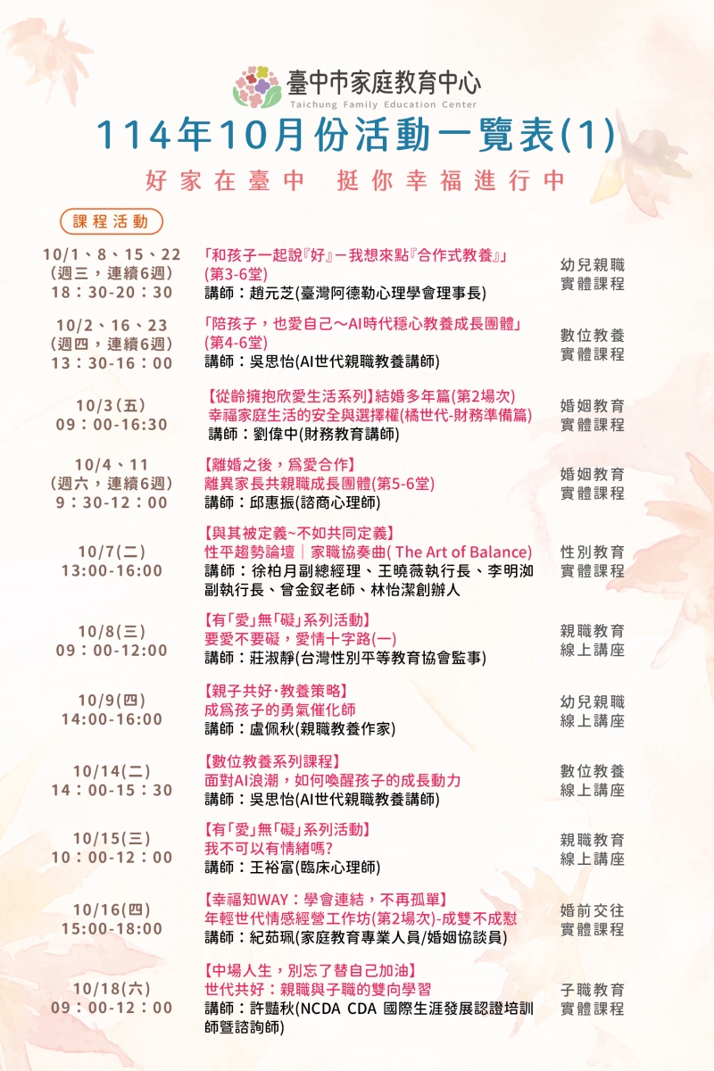 臺中市家庭教育中心114年10月份活動一覽表