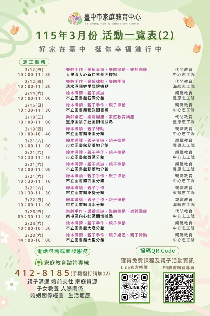臺中市家庭教育中心【115年3月份活動一覽表】🍃春日幸福登場🍃