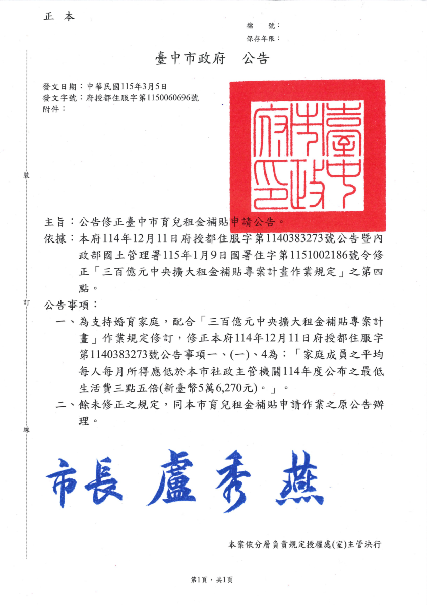 臺中市政府115年3月5日府授都住服字第1150060696號修正臺中市育兒租金補貼申請公告1份