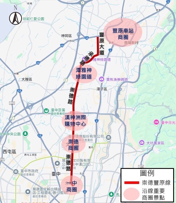 市府捷運工程局長蘇瑞文表示,紅線主線段路廊行經北區、北屯區、潭子區、神岡區、豐原區等行政區,作為串聯服務台中核心與豐原副都心主要路廊之一,沿線服務一中商圈、崇德商圈、漢神洲際購物中心及台鐵豐原車站等,行經眾多重劃區,可提供觀光與基本旅運需求,進而帶動市區觀光及經濟發展,滿足通勤、通學需求。