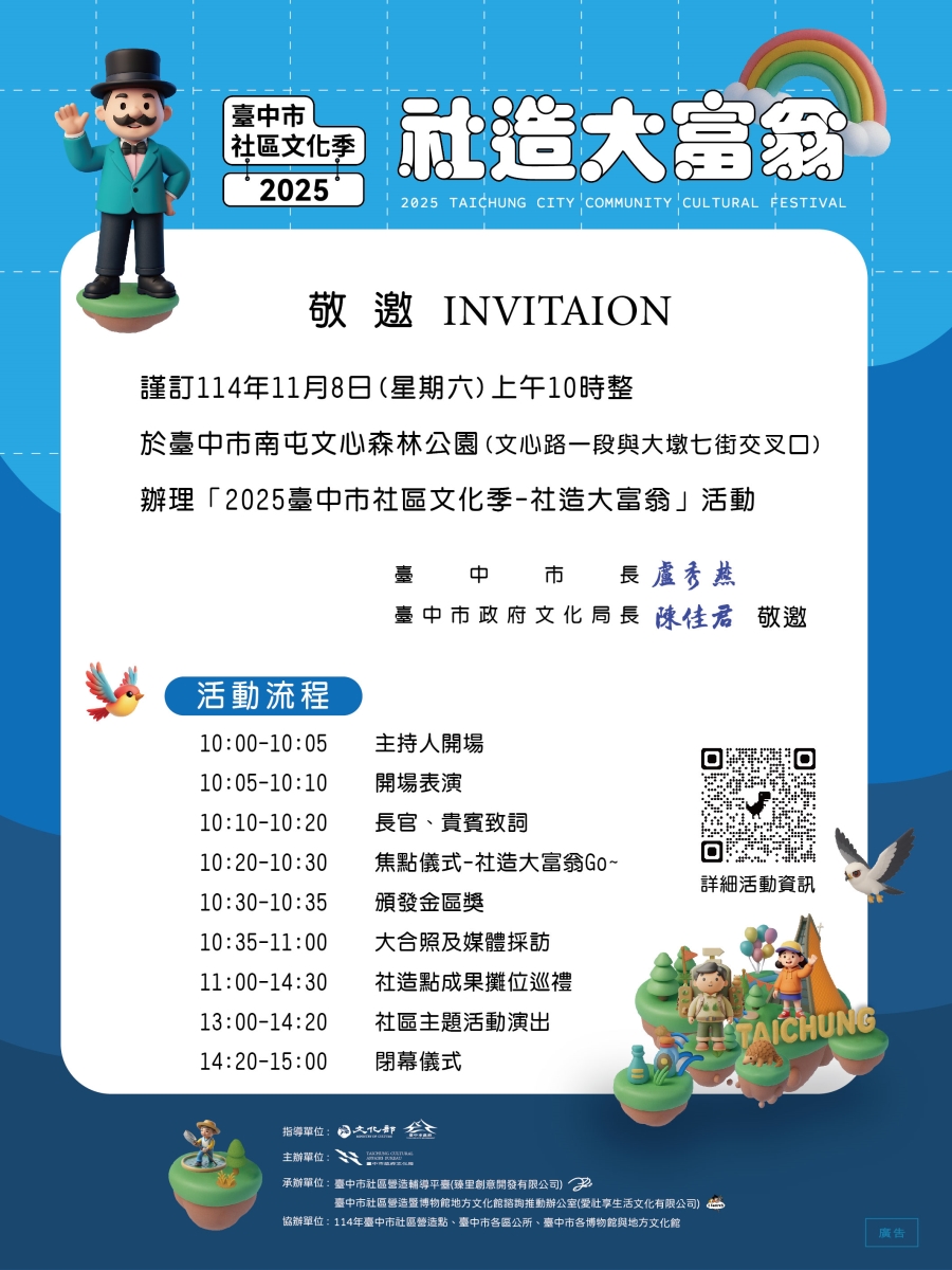 為展現臺中市社區營造成果,串聯114年度社造點、各區公所、社區大學等,共同呈現社區的主題特色,訂於本(114)年11月8日(星期六)上午10時至15時於本市文心森林公園南側溜冰場(文心路一段與大墩七街交叉口)舉行,歡迎踴躍參加。