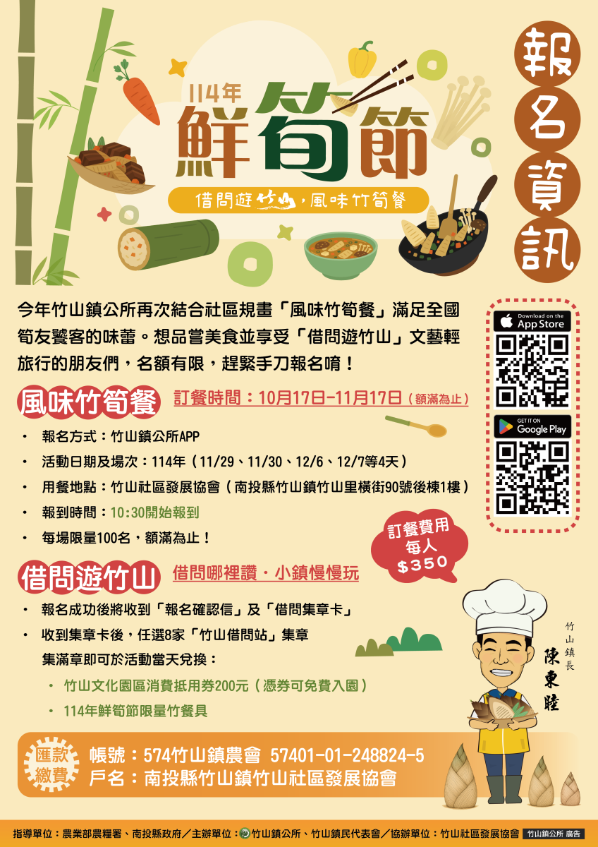 一、本活動規劃「借問遊竹山」集章輕旅行及結合社區推出「風味竹筍餐」滿足全國筍友饕客的味蕾。
