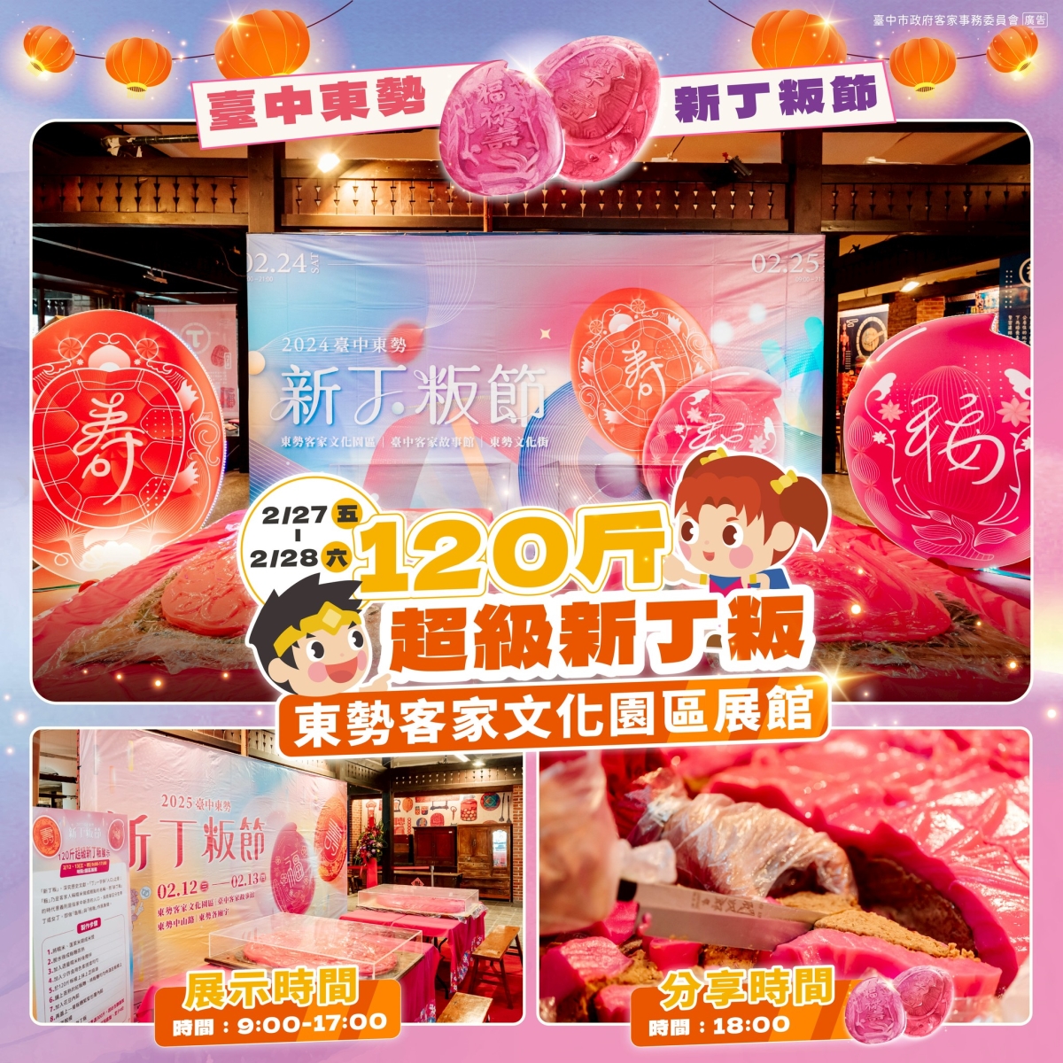 一、「新丁粄節」是臺中東勢客庄擁有百年歷史的民俗活動。在每年「正月半」,由新丁會舉辦祈福及還願活動,當年家中新生或新婚者,會製作新丁粄還願,並分享給所有會員;凡是還願者所供的新丁粄最大最重者,能得到新丁會發給豐厚的公賞金獎勵,逐漸形成全臺獨一無二的「鬪粄文化」,且強調與親朋好友「分享喜悅」;發展至今,已成為全國客庄盛事之一。